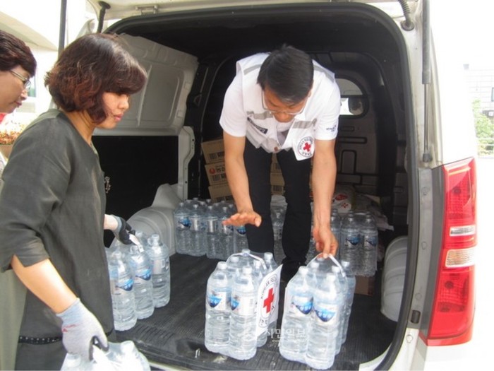 대한적십자사 봉사회 경기도 양평지구는 지난 16일 중동호흡기증후군(MERS·메르스)으로 자가격리돼 있는 4가구 주민들에게 지원할 긴급 구호물품 14세트를 경기 양평군 보건소에 전달했다. 사진은 이날 대한적십자사 봉사회 관계자들이 군 보건소로 전달할 물품을 나르고 있는 모습.(사진제공=양평군청)