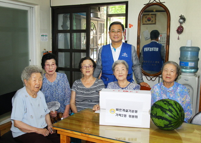 지난 16일 서울 송파구 바르게살기운동송파구협의회 가락2동위원회 회원들과 함께 가락2동내 경로당을 방문한 류승보 의원이 경로당 노인들에게 떡과 수박을 전달하고 기념촬영을 하고 있다.(사진제공=송파구의회)