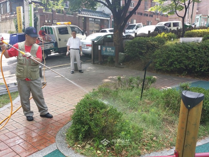 서초구는 최근 이상기후로 발생한 가뭄으로 인한 지역내 수목관리를 위해 지역내 관목류 물주기를 실시했다. 사진은 급수통(1000리터)과 양수기, 호스를 탑재한 행정차량을 이용해 분토골 어린이공원과 당골 어린이공원 등의 관목류에 물을 주고 있는 모습.(사진제공=서초구청)