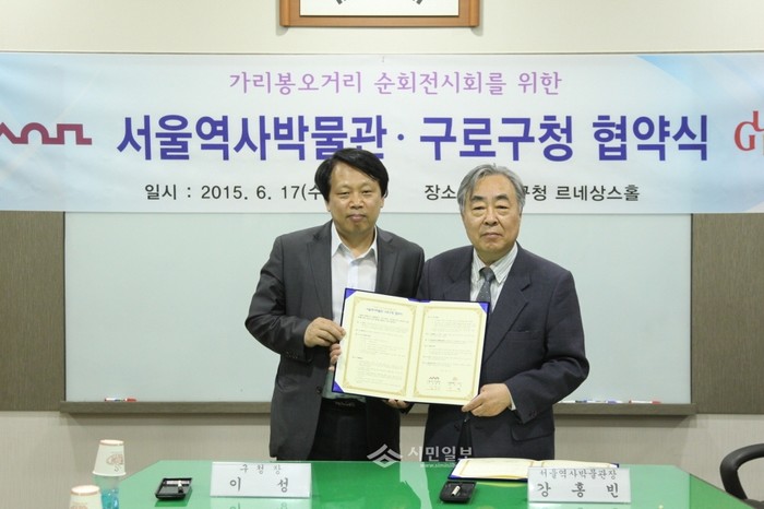 지난 17일 서울 구로공단의 의미를 지역주민들에게 알리기 위해 이성 구청장(왼쪽)이 현재 가리봉오거리전을 전시하고 있는 서울역사박물관과 ‘구로구 내 전시에 관한 업무협약’을 체결하고 기념촬영을 하고 있다.(사진제공=구로구청)