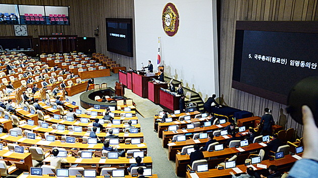 18일 오전 서울 여의도 국회에서 열린 제334회 국회(임시회) 제2차 본회의에서 황교안 국무총리 후보자 임명동의안 표결이 재적의원 278명 가운데 찬성 156표, 반대 120표, 무효 2표로 가결되고 있다.