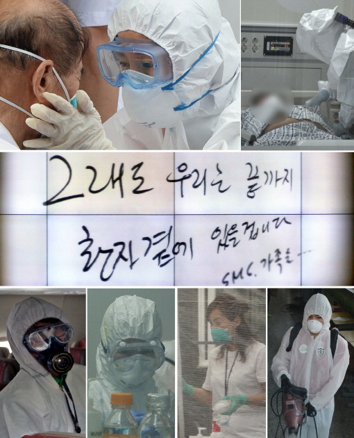 사진은 메르스 발생 한 달(19일)을 앞둔 18일 메르스 퇴치를 위해 노력하는 의료병원 관계자와 정부 방역담당자들의 한 달 모습과 삼성서울병원에 쓰인 의료진들의 다짐 문구.