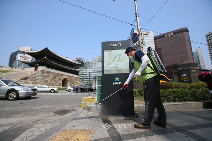 서울 중구는 18일 메르스 확산방지를 위해 방역기동반을 가동해 남대문시장·평화시장 등 전통시장 일대를 방역했다. 사진은 구 관계자가 남대문시장을 방역하는 모습.(사진제공=중구청)