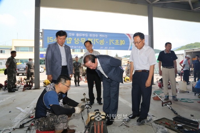 최근 경기 연천군 신서면에서 지역내 영농인들과 군부대를 대상으로 실시한 예초기·농기계 무상 합동수리 현장을 방문한 김규선 연천군수(가운데)가 농기계 수리 장면을 살펴보고 있다.