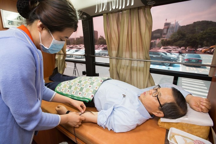 경북 구미시가 최근 시청을 방문한 대한적십자 대구 경북혈액원 소속 헌혈버스에서 시청 공무원 등이 참여한 가운데 생명 난무 사랑의 헌혈봉사를 진행했다. 사진은 이날 봉사에 참여한 남유진 구미시장(오른쪽)이 헌혈을 하고 있는 모습.(사진제공=구미시청)