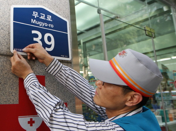 서울지방우정청이 우편번호가 국가기초구역번호(5자리)로 개편됨에 따라 국민이 쉽고 편리하게 사용할 수 있도록 서울시에서 제작한 01000부터 08999까지의 새우편번호 스티커를 이달 말까지 서울 전지역 건물번호판에 부착한다. 직원들이 건물번호판 우편번호를 교체하고 있는 모습.(사진제공=서울지방우정청)