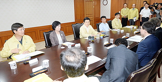 황교안 국무총리(왼쪽 세번째)가 21일 오후 서울 종로구 세종대로 정부서울청사에서 열린 메르스(중동호흡기증후군)관련 의료전문가 간담회에 참석해 모두발언을 하고 있다.