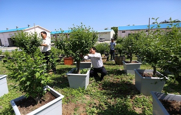 | ▲ 해남군 옥천면사무소(면장 송장근)에서는 오는 8월15일 광복 70주년 기념 및 면사무소 개청 101주년 기념을 위해 우리나라 꽃 무궁화 꽃 축제를 위해 무궁화 분재를 손질하고 있는 모습 | ||