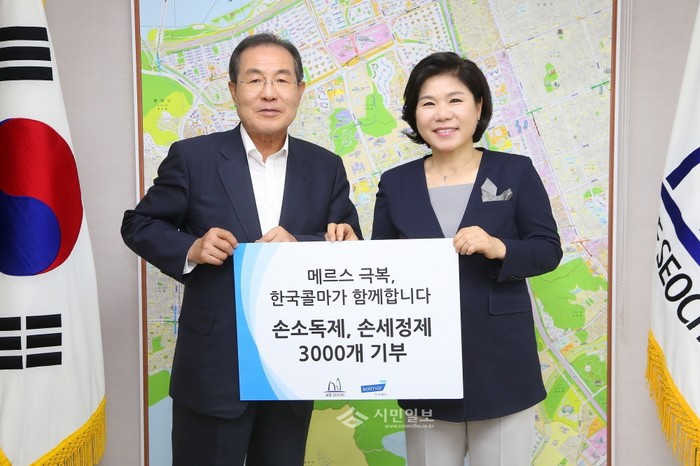 22일 윤동환 한국콜마(주) 회장(왼쪽)은 메르스로 어려움을 겪는 주민과 메르스 퇴치를 위해 노력하는 서울 서초구청 직원들을 위해 손 세정제 3000개를 조은희 구청장(오른쪽)에게 전달하고 기념촬영을 하고 있다. (사진제공=서초구청)