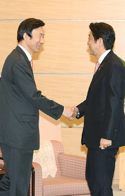 일본을 방문 중인 윤병세(왼쪽) 외교부 장관이 22일 아베 신조 일본 총리를 예방, 인사를 나누고 있다.