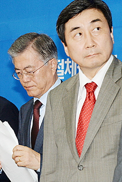 22일 오전 서울 여의도 국회에서 새정치민주연합 문재인 대표가 메르스 관련 특별 성명 발표를 마친 뒤 자료를 정리하고 있다. 오른쪽은 이종걸 원내대표.