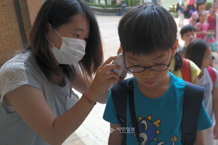 경기 부천시 상원초등학교 학부모회가 최근 메르스 확산 방지를 위해 등굣길 학생들을 대상으로 발열검사와 손 소독을 진행했다. 사진은 학부모회 회원이 한 학생의 체온을 검사하고 있는 모습.