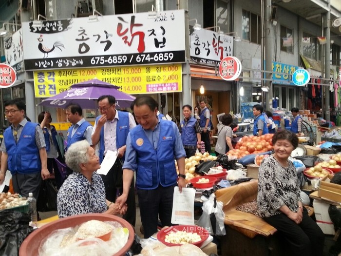 경기 안성시가 지난 22일 '지역경제 활성화의 날'을 맞아 메르스 장기화에 따른 지역경제 침체를 막기 위해 전통시장 등을 찾아 물품을 구입했다. 사진은 이날 시장을 찾은 황은성 시장(가운데)이 상인과 악수하고 있는 모습. (사진제공=안성시청)