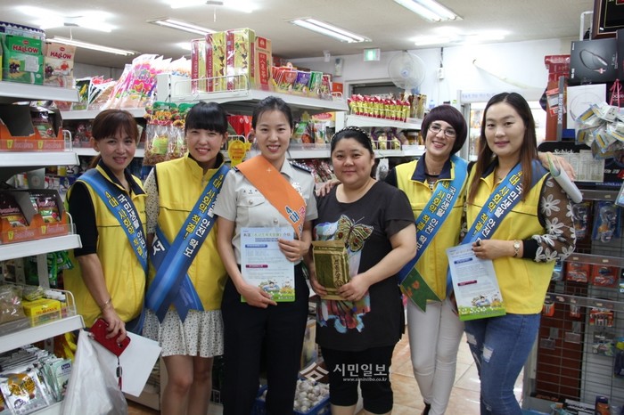 충남 아산경찰서는 지난 22일 온천동 소재 온양온천전통시장에서 '하모니외국인치안봉사단'과 함께 불량식품 근절 캠페인을 개최했다. 사진은 이날 봉사 참여자들이 캠페인을 벌이며 기념촬영한 모습. (사진제공=아산경찰서)