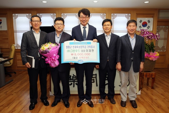 (주)그린우드는 지난 22일 (재)장흥군인재육성장학회에 인재육성 장학금 500만원을 기탁했다. 사진은 기탁식에서 김성 이사장(가운데)과 (주)그린우드측 관계자들이 함께 기념촬영한 모습. (사진제공=장흥군청)
