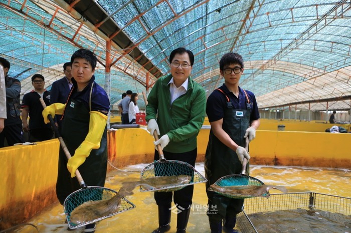신우철 전남 완도군수가 최근 어류의 질병을 예방하고 면역력을 증강시키는 완도 명품광어 백신 공급사업 현장을 방문했다. 사진은 신 군수(가운데)가 완도 명품광어 홍보를 위해 싱싱한 광어를 들고 포즈를 취하고 있는 모습.(사진제공=완도군청)