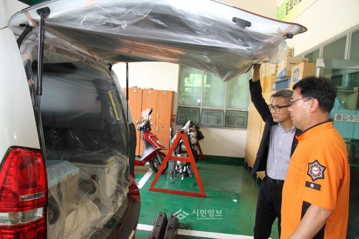 송파소방서 김시철 서장이 지난 22일 중동호흡기증후군(MERS) 전담구급대를 운영하고 있는 방이119안전센터를 방문해 구급대원들을 격려했다. 사진은 김 서장이 소방대원과 함께 구급차를 살펴보고 있는 모습.(사진제공=송파소방서)