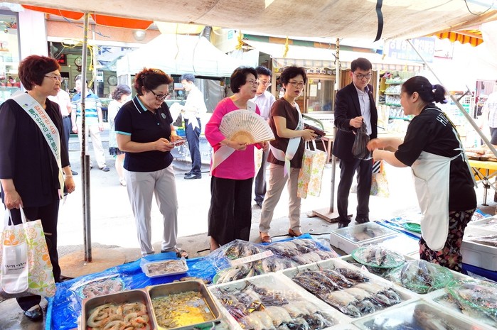 인천 부평구가 지난 22일 메르스로 인한 침체 분위기를 끌어올리고자 직원들이 일신시장과 부평시장로터리 지하도상가를 방문해 시장을 보는 '전통시장 가는 날' 행사를 진행했다. 사진은 홍미영 구청장(가운데)이 시장 생선가게를 찾아 상인과 이야기하고 있는 모습.(사진제공=부평구청)