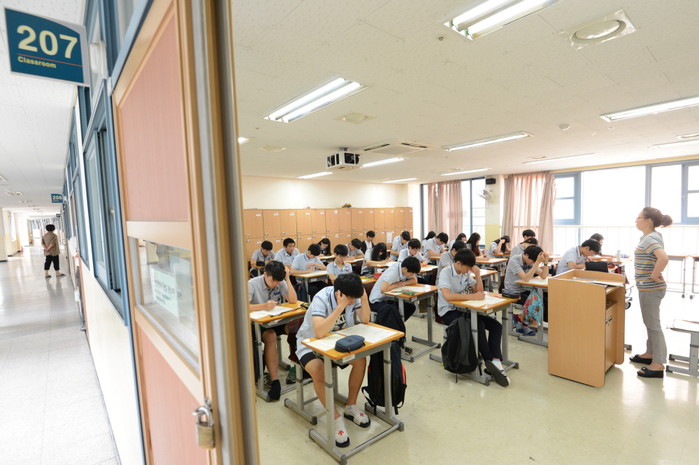 '2015년 국가수준 학업성취도 평가'가 실시된 23일 오전 서울 강서구 내발산동 수명고등학교에서 2학년 학생들이 답안지를 작성하고 있다. /뉴시스