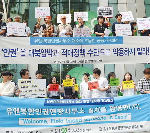 대학생 북한인권동아리 회원들로 구성된 북한인권학생연대 회원들이 23일 오전 서울 종로구 서린동 ‘유엔 북한인권사무소’ 앞에서 사무소 개소를 환영하는 기자회견을 하고 있다(아래). 앞서 평화통일시민행동, 서울진보연대 등 시민단체 회원들이 같은 장소에서 사무소 개소를 반대하는 기자회견을 하고 있다.