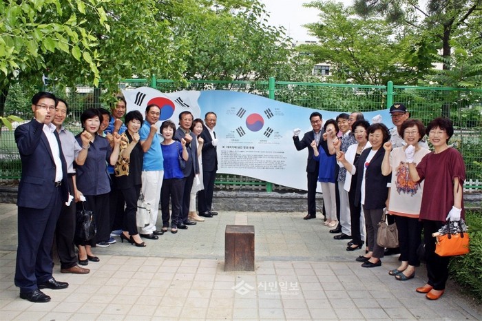 최근 송파구 잠실본동 주민센터가 '6월 호국보훈의 달'을 맞아 태극기 거리(백제고분로 15길 7)에 대형 태극기·무궁화 설명판을 설치하고 기념촬영을 하고 있다.(사진제공=송파구청)