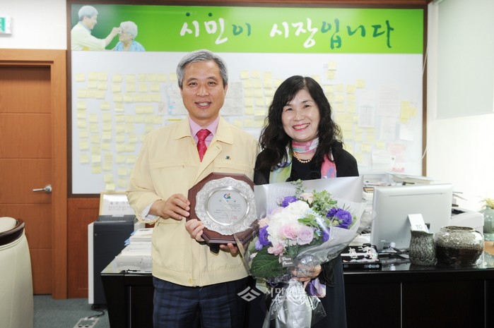 경기 오산시가 24일 민선6기 제10대 '1일 명예시장'으로 오산여자중학교 영어교사로 재직했던 김안나씨를 위촉했다. 사진은 위촉식에서 곽상욱 오산시장(왼쪽)과 김씨가 기념촬영한 모습. (사진제공=오산시청)
