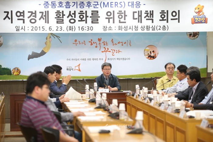 경기 화성시가 지난 23일 시청 상황실에서 침체된 지역경제를 되살리기 위한 대책회의를 열었다. 사진은 이날 지역내 경제인단체와 기업인 대표들이 참석한 가운데 채인석 화성시장(가운데)이 실천방안을 논의 중인 모습.(사진제공=화성시청)