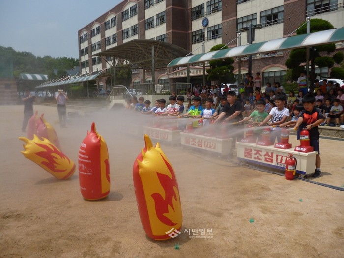경기 부천시 부흥초등학교가 지난 23일 전교생과 교직원들을 대상으로 소방안전 체험교육을 실시했다. 사진은 이날 참여 학생들이 소화기 체험교육을 통해 물소화기로 가상 화재 진압을 하고 있는 모습. (사진제공=부천교육지원청)