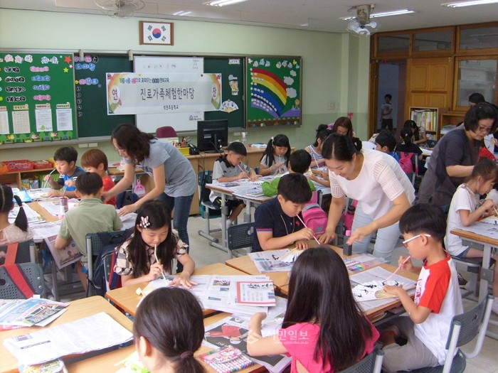 경기 부천시 석천초등학교가 지난 24일 2학년 학생들을 대상으로 부모님과 함께하는 진로체험교육을 진행했다. 사진은 체험교육에 참여한 학생들이 학부모 강사들의 지도에 따라 부채를 만들고 있는 모습. (사진제공=부천교육지원청)