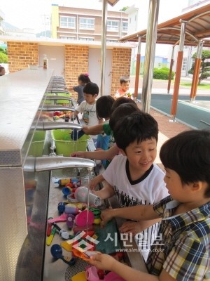전남 여수시 쌍봉초등학교 병설유치원은 최근 유치원 어린이들의 건강한 생활을 위해 보건위생 교육을 실시했다. 사진은 참여 어린이들이 교실에 있는 인형과 장난감을 세척하고 있는 모습. (사진제공=전라남도교육청)