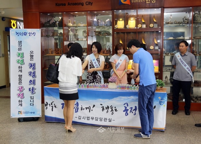 경기 안성시는 25일 오전 출근하는 시청 직원들을 대상으로 메르스 확산 예방과 부패척결의 의미로 '청렴 손 소독제' 나누기 행사를 진행했다. 사진은 이날 캠페인에서 손 소독제를 전달하고 있는 감사법무담당관 직원들의 모습. (사진제공=안성시청)