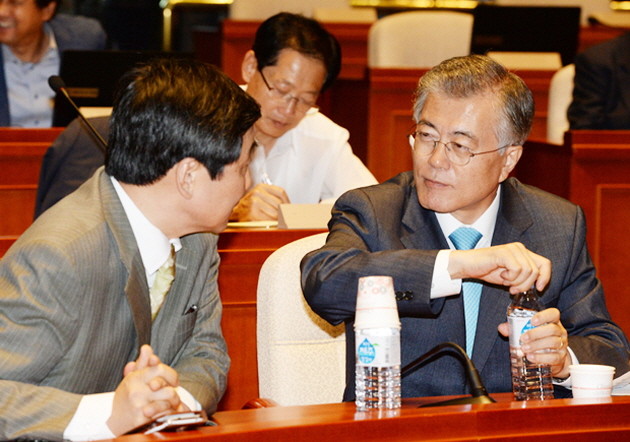 새정치민주연합 문재인 대표와 이종걸 원내대표가 박근혜 대통령이 국회법 개정안에 대해 거부권을 행사한 25일 서울 여의도 국회에서 열린 긴급 의원총회에서 대화를 나누고 있다.