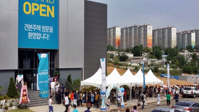 지난 20일(토) GS건설 옥길자이 견본주택에 몰린 내방객들이 외부에서부터 줄을 지어 입장하고 있다.