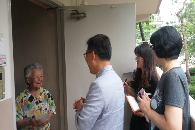 경기 고양시 일산서구 일산3동 주민센터가 최근 '후곡마을 홀몸노인 순회방문'을 실시했다. 사진은 주민센터 직원들이 한 노인의 집을 방문해 메르스 예방수칙 등을 홍보하고 있는 모습.(사진제공=고양시청)