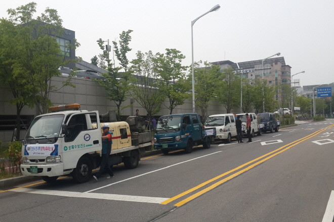 최근 경기 안산시가 중동호흡기증후군(메르스) 확산에 따른 시민의 불안감 해소 및 하절기 모기 등 해충으로부터 감염병 예방을 위해 시 전역 소독을 실시했다. 사진은 일제 소독을 위해 나란히 서 있는 소독차들과 소독준비를 하고 있는 구청 직원들의 모습.(사진제공=안산시청)