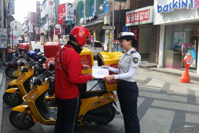인천 중부경찰서는 최근 동인천 맥도날드 일대 이륜배달업소를 방문해 운전자 대상 이륜차 안전운행을 위한 교통안전 교육을 진행했다. 사진은 홍보에 나선 경찰관이 운전자에게 교통안전 교육 홍보물을 전달하고 있는 모습.(사진제공=중부경찰서)