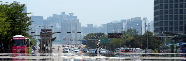 낮 최고 기온이 31도까지 오르며 무더운 날씨가 이어지는 28일 오후 서울 영등포구 여의도에서 한낮 뜨거운 태양에 달궈진 도로위로 아지랑이가 피어오르는 가운데 한 어르신이 건널목을 건너고 있다.