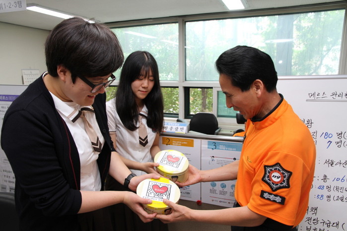 서울 송파소방서 메르스 대책상황실에 지난 26일 잠실여자고등학교 선생님과 학생들이 일선에서 고생하는 소방관들을 격려하고자 방문했다. 사진은 이날 소방서를 찾은 학생들이 소방대원에게 소정의 위문품을 전달하고 있는 모습.(사진제공=송파소방서)