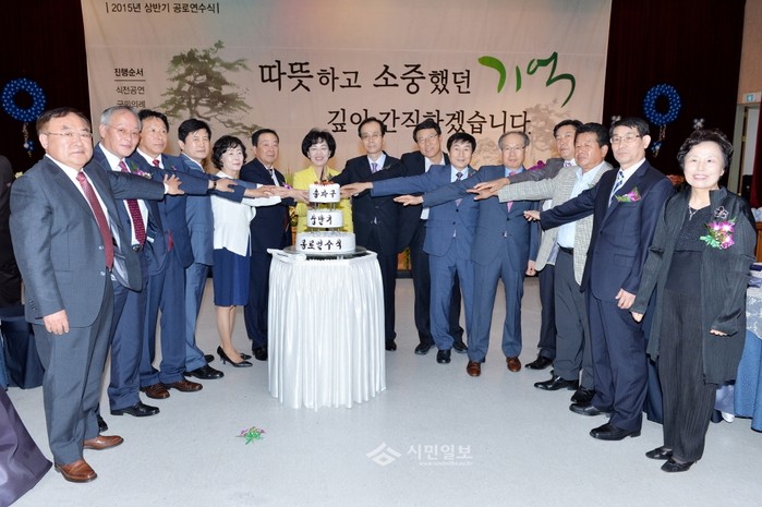 최근 송파구청 대강당에서 열린 '2015년 상반기 공로연수식'에 참가한 박춘희 구청장(가운데)과 공로연수 예정자들이 기념 케이크 커팅식을 하고 있다.(사진제공=송파구청)