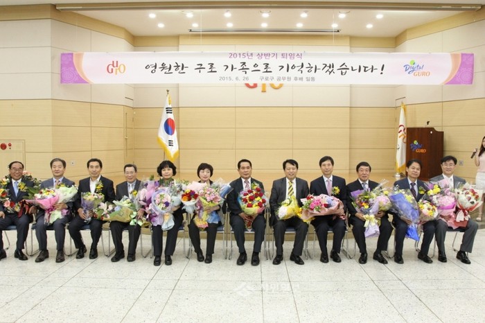 최근 구로구 구청강당에서 퇴직자들의 공직생활 마무리을 축하하고, 그간의 노고를 격려하기 위해 마련된 ‘2015년 상반기 퇴임식’에 참가한 퇴직자들이 퇴임식 후 꽃다발을 들고 기념촬영을 하고 있다.(사진제공=구로구청)