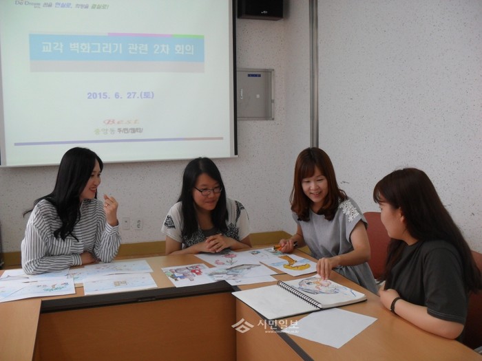 경기 동두천시 중앙동 주민자치위원회가 오는 7월11일 실시되는 '교각 벽화그리기' 사업을 위해 개최한 2차 회의에서 참가 자원봉사자들이 교각에 그릴 그림에 대해 토론하고 있다.(사진제공=동두천시)