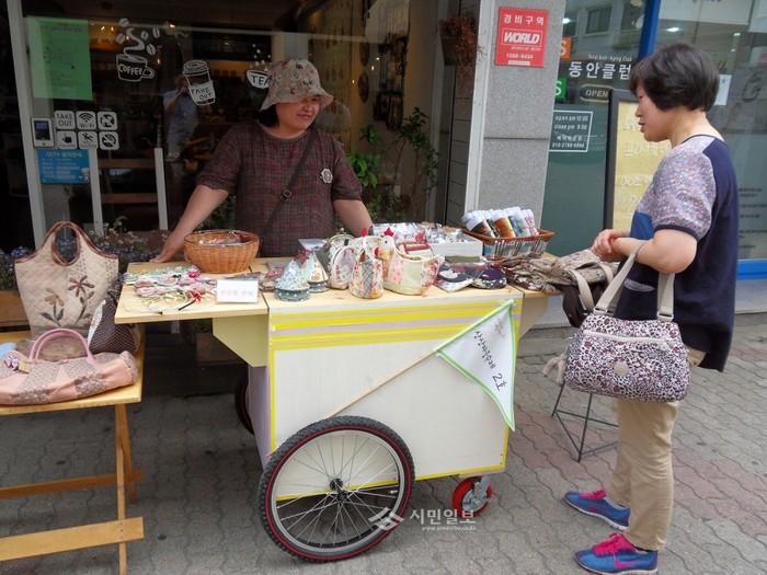 경기 부천시 상2동 주민센터와 푸른마을 사이 골목길에서 최근 상상지기공동체가 주최한 '플리마켓'이 열렸다. 사진은 이날 플리마켓에 한 참여자가 직접 만든 퀼트작품을 판매하고 있는 모습.(사진제공=부천시청)