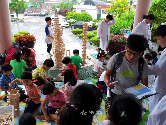 전남 보성교육지원청이 지난 28일 지원청 앞뜰에서 보성영재원 학생들을 대상으로 '재능나눔 교육기부 과학부스'를 운영했다. 사진은 이날 행사에 참여한 지역내 초등학생들이 블럭쌓기를 하고 있는 모습.(사진제공=전라남도교육지원청)