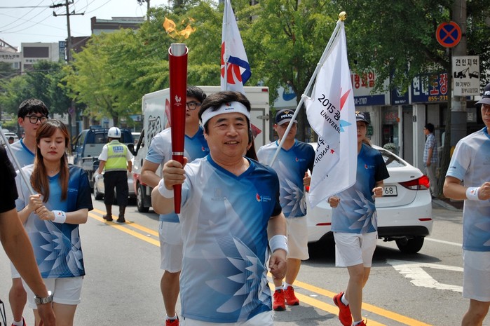 2015 광주하계유니버시아드대회 성화가 29일 전북 익산시청을 출발한 가운데 첫번째 주자로 나선 박경철 시장이 환한 웃음을 선보이고 있다./뉴시스
