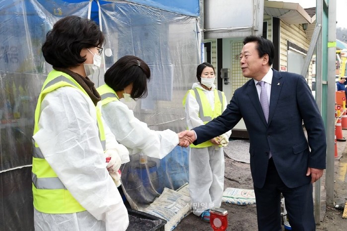| ▲ 조억동 광주시장이 구제역 방역 현장을 방문해 관계자들을 격려하는 모습. | ||