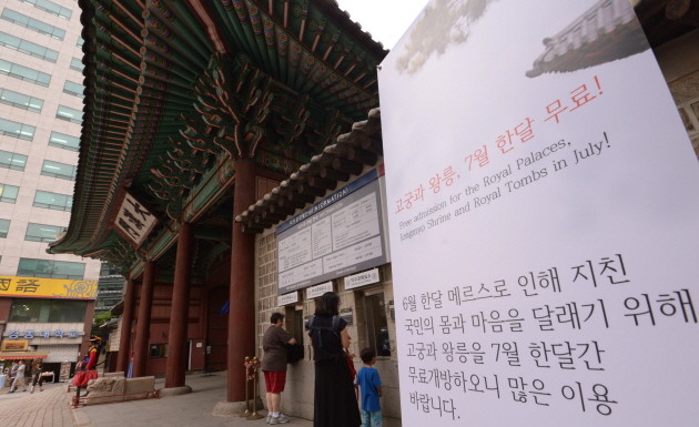 30일 오후 서울 중구 정동 덕수궁 대한문 앞 매표소에 무료개방을 알리는 표지판이 붙어 있다. 문화재청(청장 나선화)은 본격적인 휴가철이 시작되는 7월 한 달 동안 경복궁·창덕궁(후원 제외)·창경궁·덕수궁 등 4대 궁과 종묘, 조선왕릉을 메르스로 지친 국민의 몸과 마음을 달래고 침체되어 있는 국내 관광산업과 경제가 활성화를 위해 내·외국인 관람객에게 무료로 개방한다.