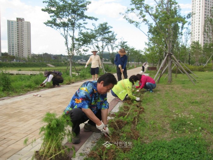 경기 고양시 창릉동 주민자치위원회는 최근 창릉천변 산책로에 코스모스 심기 행사를 진행했다. 사진은 이날 행사에 참여한 회원들이 코스모스를 식재하고 있는 모습.(사진제공=고양시청)