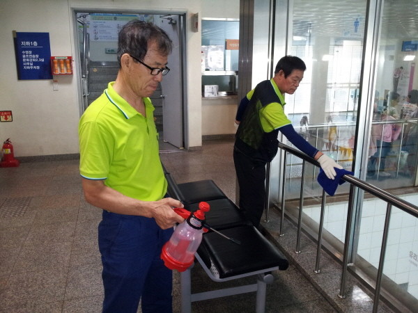 지난 29일 서울 강동구 온조대왕문화체육관 관계자들이 중동호흡기증후군(메르스) 차단을 위해 체육관 구석구석에 살균소독제를 도포한 후 깨끗이 닦아내고 있다.(사진제공=강동구도시관리공단)