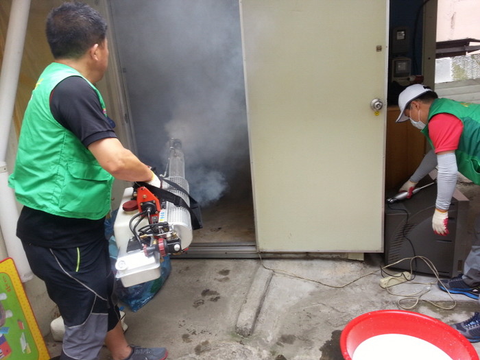경북 구미시 원평1동 새마을남녀지도자들로 구성된 행복한 보금자리만들기 해피봉사단은 최근 지역내 기초수급가정을 방문해 집수리 봉사활동을 펼쳤다. 사진은 이날 참여자들이 집안을 소독하고 있는 모습.(사진제공=구미시청)
