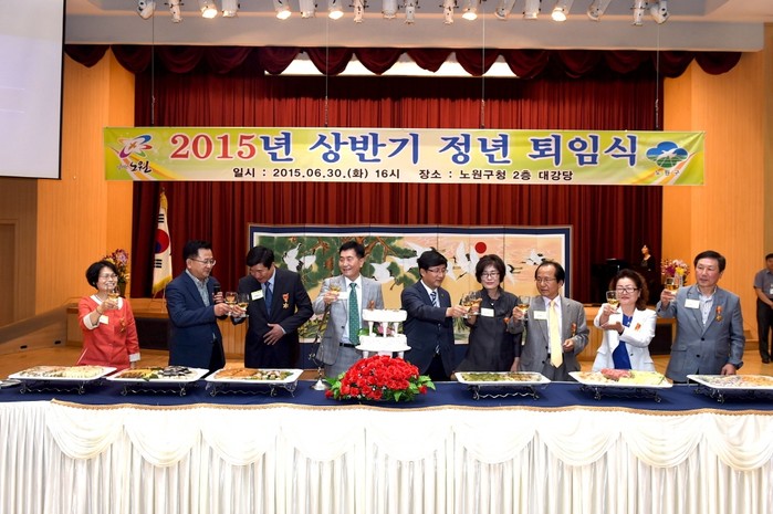 노원구는 최근 구청 2층 대강당에서 '2015년 상반기 정년퇴임식'을 개최했다. 사진은 김성환 노원구청장(가운데)이 상반기 정년퇴임자들과 건배를 하며 퇴임자들의 '제2의 인생' 출발을 축하하고 있는 모습.(사진제공=노원구청)